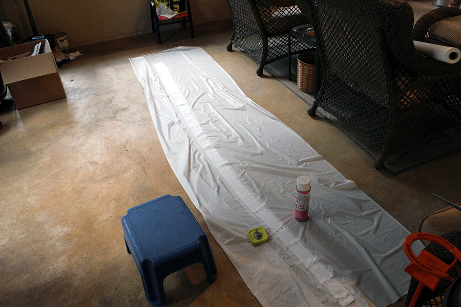 First to make the tie. I read somewhere that the tie needed to be 3 yards long and I didn’t want a mid-seam which would create a stress point on satin fabric that shreds like crazy. The LAST thing the bride needs is to have the tie holding in the girls to give out during the reception! So I purchased a full 3 yards of both the satin and organza even though I didn’t need that much. I know you’re supposed to sew sheers on tissue paper, and I didn’t have any, but I did have a huge roll of white plastic table cover left over from a company Christmas party. (It’s always good to be on the decorating committee in case of any leftovers). I’ve experienced pulling paper off the back of quilt pieces when paper piecing, so I thought, well – why not plastic too? I swept off the screened-in back patio to get rid of the dog fur, locked the dogs into the house, and rolled it out.