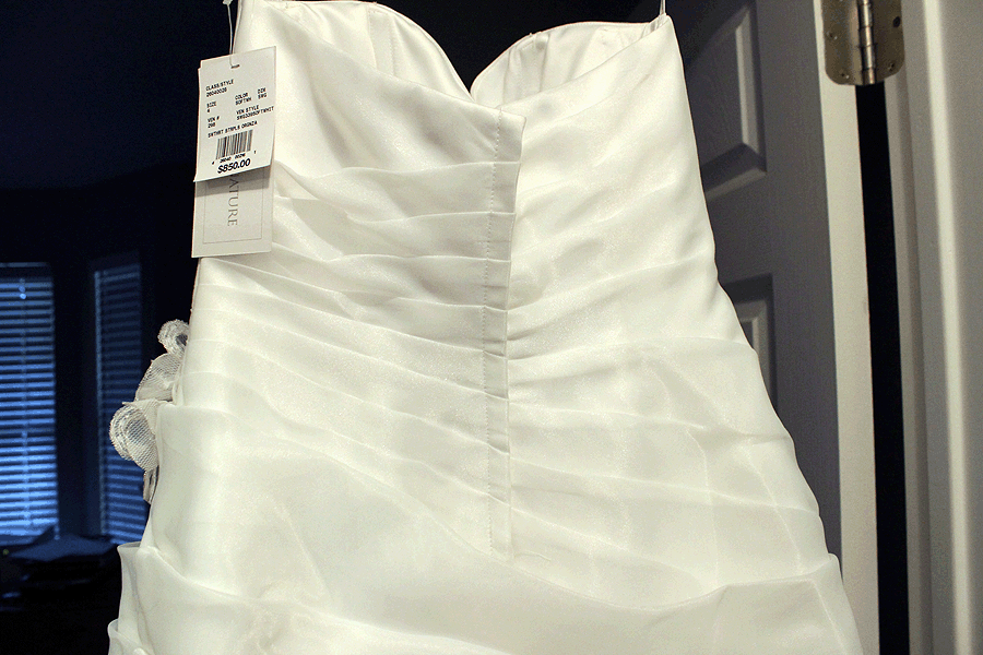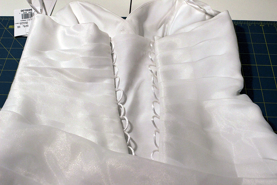 I know that wedding gowns come with an additional 3 inches in seam allowance on each side – that seems to be an industry standard. I did some online homework before they arrived and found the perfect solution – the corset back wedding gown. That would solve the problem of her possibly getting bigger before the wedding after the alteration. When they arrived, I see why no seamstress will touch it. This strapless dress is covered top to bottom in a layer of silk organza folds and ruffles. Oh boy. Fortunately, the bride wasn’t fussy and when I asked her about converting the back of the dress, she was good with it. I mean really, what choice did she have? When she put the dress on, the top of the zipper had a 5 inch gap and there was no way it was going to close. Here is the front of the dress.