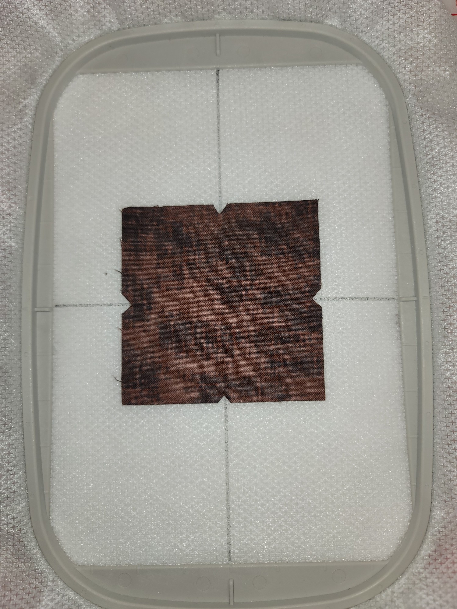 FABRIC MARKING: I’m not a fan of marking on top of my fabric unless absolutely necessary. Instead, I prefer to notch the sides at the middle points with a small V-shaped snip. I mark crosshairs on my stabilizer and then align the snips with those marks. This will absolutely prevent accidentally stitching clear vinyl over marks you forgot to wash or iron away. The tiny snips you make will not interfere with the quilting or embroidery designs. They should be small enough to be trimmed away when you trim the block.